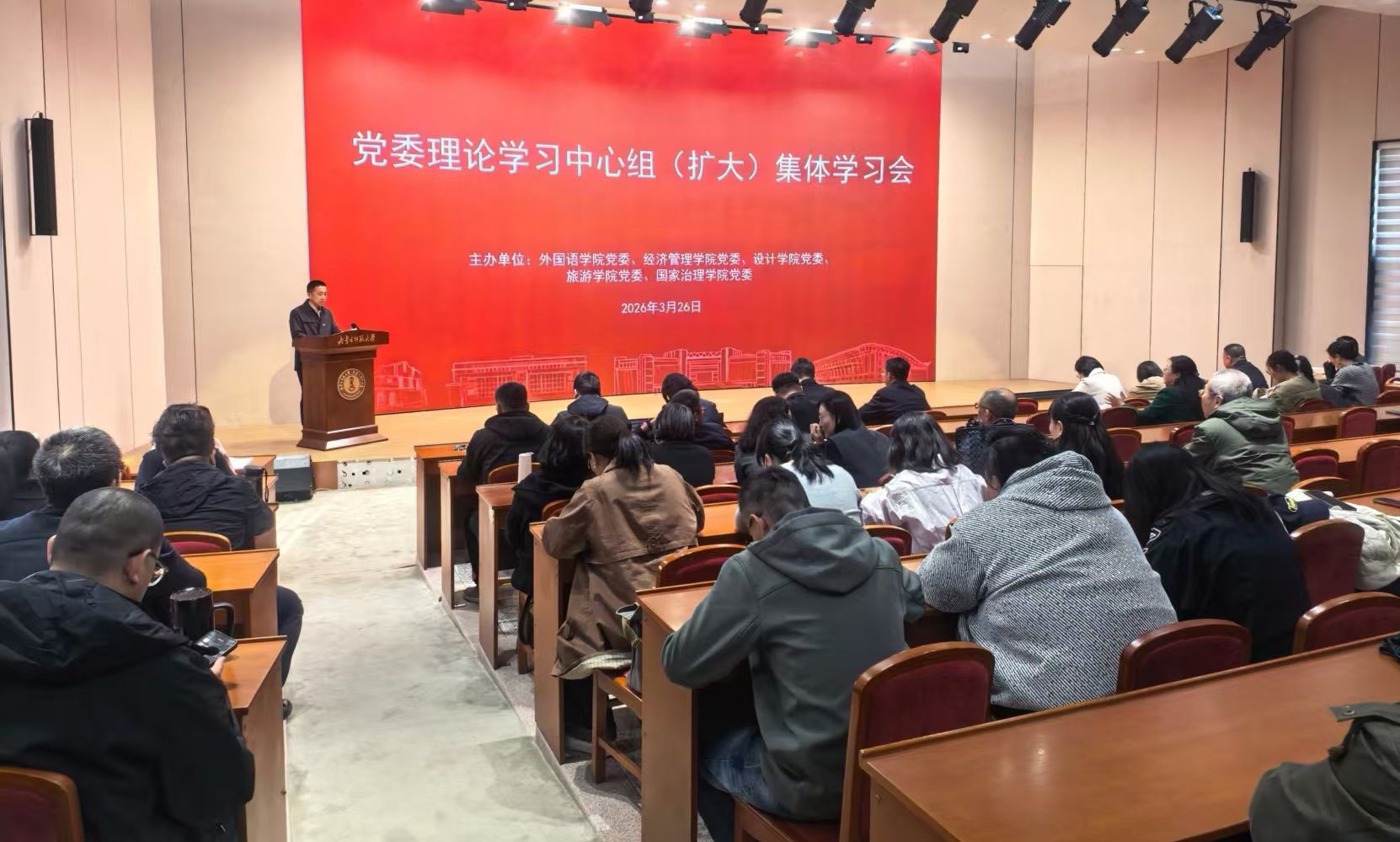 近日,外国语学院党委、经济管理学院党委、国家治理学院党委、旅游学院党委、设计学院党委在赛罕校区学术交流中心信息楼报告厅,联合举办党委理论学习中心组(扩大)集中学习会暨树立和践行正确政绩观学习教育读书班。五学院党委委员、科级干部、党员及教师代表共160余人参加学习,会议由外国语学院党委书记黄鑫主持。